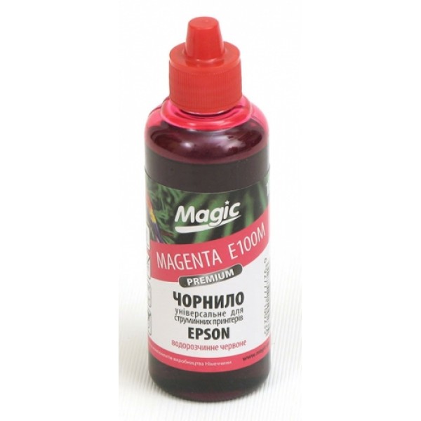Чорнило Magic Epson Premium Magenta E100M. Водорозчинні чорнила для всіх чотирикольорових принтерів Epson.виготовлено з компонентів Німецького виробництва.Водорозчинні. Термін придатності: 36 місяців.Обєм чорнила 100 мл.