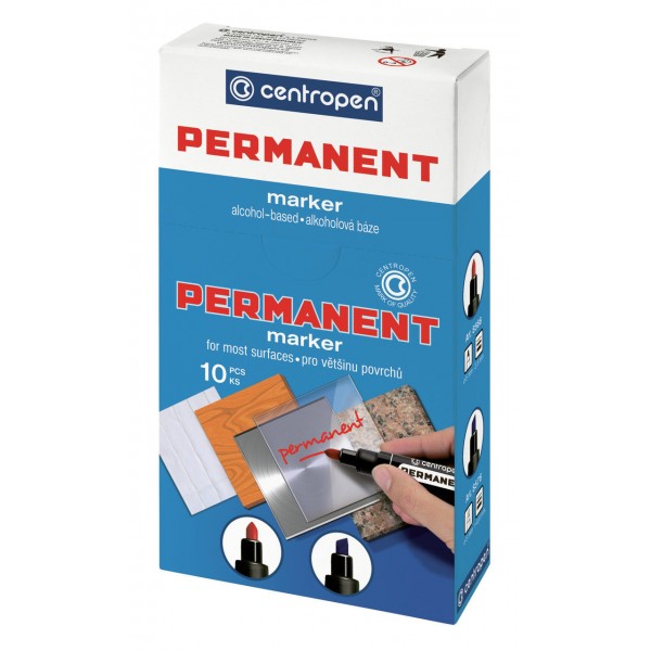 Маркер перманентний Centropen 8566 2,5мм Перманентний маркер Centropen застосовується для нанесення написів на поверхні будь-якого типу. Виготовлений з якісного міцного пластику, має закруглений носик діаметром 2,5 мм. Перманентний маркер на спиртовій основі має стійкі до стирання і атмосферних впливів чорнило . Можна використовувати при нанесенні написів на склі, дереві, шкіри, паперу, склі, пластику, плівці.